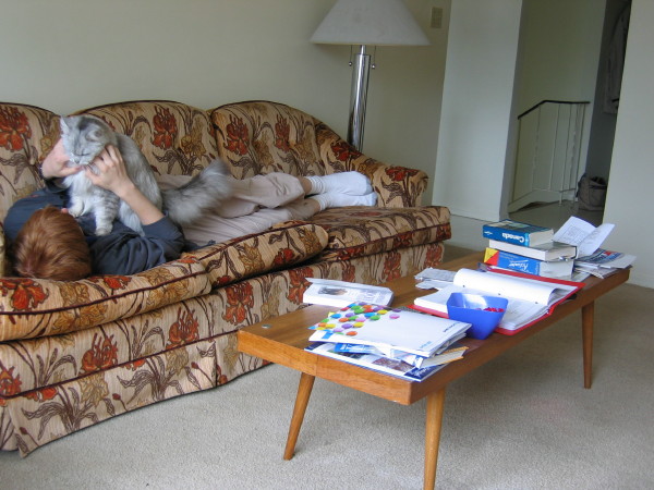 Все журнальные столики завалены Сережиными книжками, он готовится к очередному экзамену, потому в доме беспорядок, но ему так удобнее.