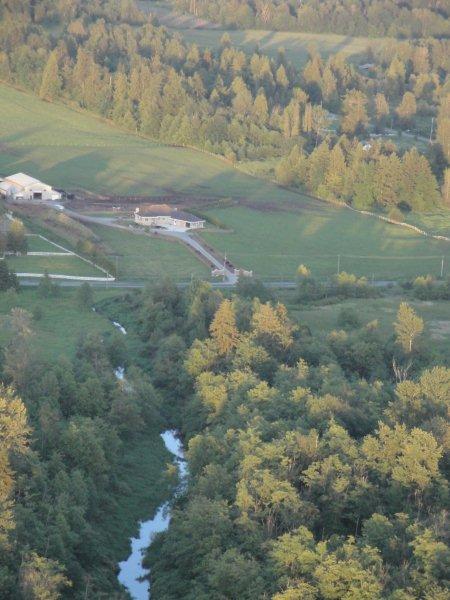 I closed my eyes for a minute. Is this really happening? Am I actually flying in a hot air balloon? When I opened my eyes we were floating over farms, dense forests and green fields with Mount Baker always in clear view. There was no feeling of movement, just the sensation of being suspended in air. Like Arianna in Jane Urquhart’s novel Changing Heaven, I felt as light as milkweed. I could see deer running in and out of the forest and cows making their way home. A wooden bridge crossed a stream and dogs barked at us from farmyards. It was like looking down on a miniature rural scene. I relaxed and enjoyed every moment.
