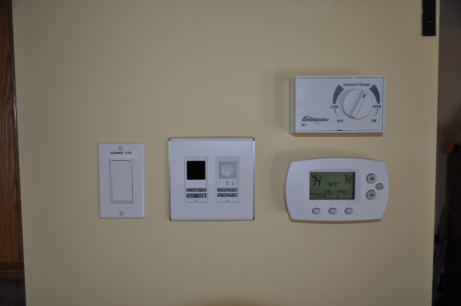 на котором выставляешь температуру (в какое время суток какая должна быть), и там же показана нынешняя. Чуть выше термо датчика-найстройщика — регулятор влажности на этаже. Самая левая кнопка — принудительный вентилятор, для лета. В теплое время, когда нет необходимости отапливать дом, а даже наоборот, хочется его остудить, по тем же отопительным трубопроводам принудительно можно пустить холодный воздух — с улицы берется и прогоняется по дому. Технически, в эту систему можно вставить кондер — воздух будет охлаждаться и уже прохладным бегать по дому. Но в нашем климате в этом необходимости 🙂 Девайс по центру — домофон. Их натыкали по дому в разных местах — если кто в дверь звонит, можно сразу поговорить 🙂 и не бегать к двери.