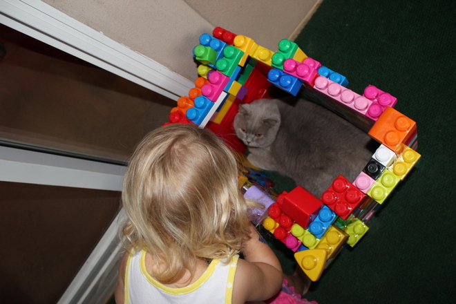 Также у нее совершенно интересное представление о том, как котики дожны с ней играть:) Так в ее мечтаниях играть с котиками означает не игра с котиками в кошачьи игрушки, а чтобы котики играли с ней в ее куклы, в конструктор и прочие детские игры:) Она страшно расстраивается, когда они не горят желанием с ней играть в ее игрушки:)
