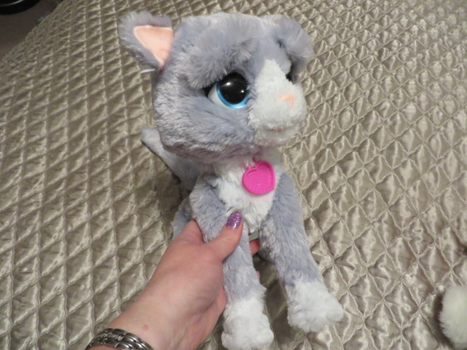 Мы нашли альтернативу живым котикам, которые царапаются и убегают от нее, и на новый год подарили ей (само собой от имени Деда Мороза:), игрушечного котика и игрушечного щенка, которые соответствовали ее требованиям к животным:) Они были мягкими и нежными, мурлыкали, урчали, скулили, хлопали глазками, дышали и двигались как живые настоящие животные, и главное, никуда не убегали и давали себя тискать сколько угодно!:) И при этом они не были безногими калеками, и имели дивные лапки:) Иза их очень полюбила и с удовольствием играет с ними и спит.