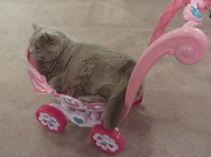Миша очень любит, когда его носят, причем не на руках, а в какой-нибудь таре:) Он сам добровольно запрыгивает в кукольную коляску, в корзину из магазина, а свою тележку, и т.д., и ждет, чтобы его носили или катали. Само собой Изе это дело очень нравится:) И Миша так может кататься бесконечно:) И даже не возражает против кукол рядом с ним:)