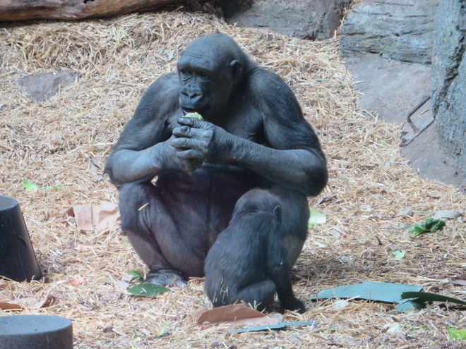 Ну и очень хорошо позировали в этот раз гориллы! Малыш у них уже подрос и самостоятельно бегает в вольере. Раньше его нежно держала на руках его мама:) Теперь она сидит в позе задумчивости:)