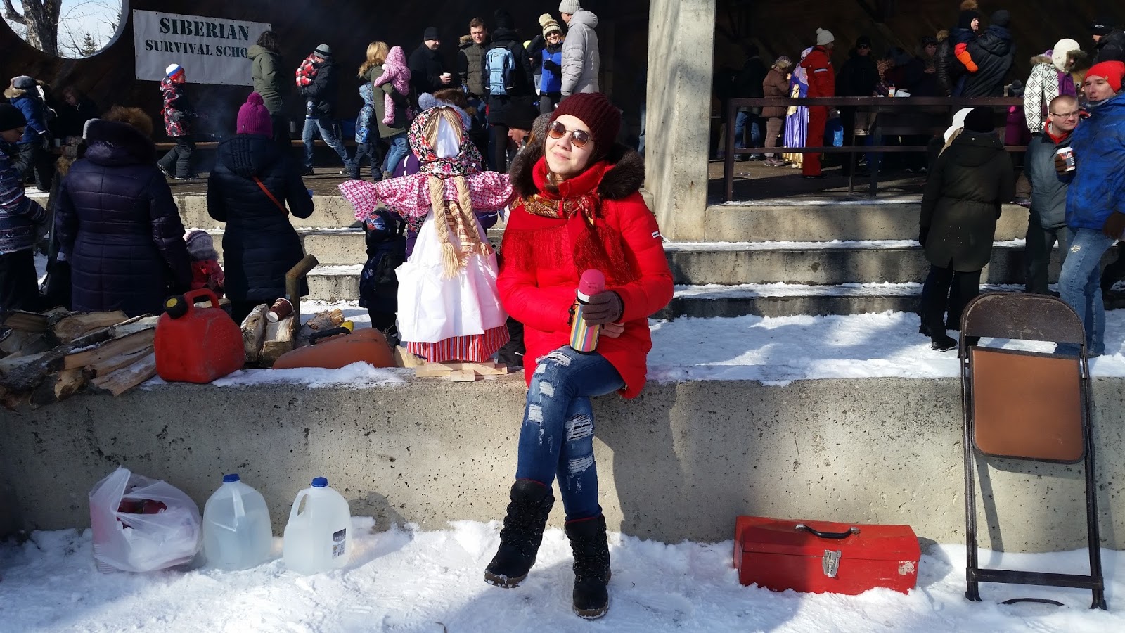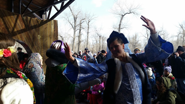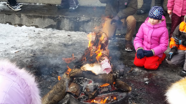 Температура в этот день была конкретно минусовая. Мы оделись, как на Северный полюс. И не прогадали. Праздник был рассчитан часа на 3-4, погреться было можно только чаем, у костра или в теплом туалете рядом с площадкой 😉
