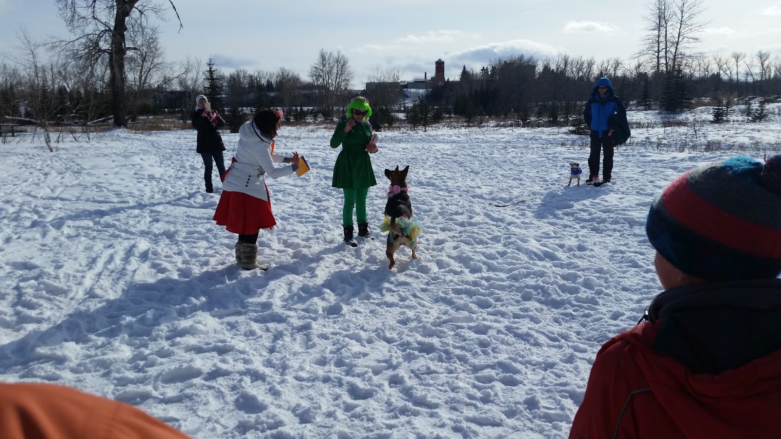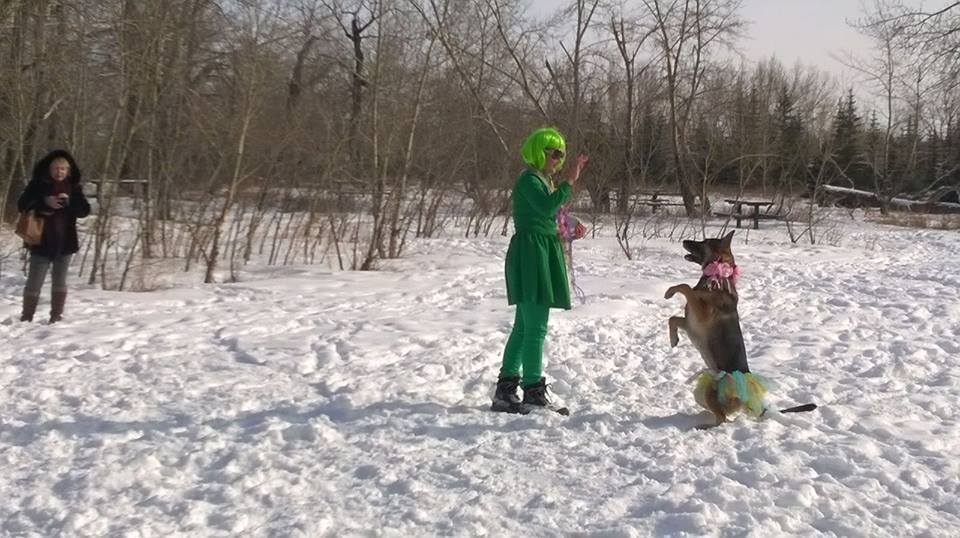 Выступление известной уже в Калгари парочки — овчарки Волчи и ее хозяйки Гульназ -встречалось всеми на ура! Тем более, что Волча была такая милая 🙂 Она изображала Весну, была одета в юбочку и бантики-цветочки.