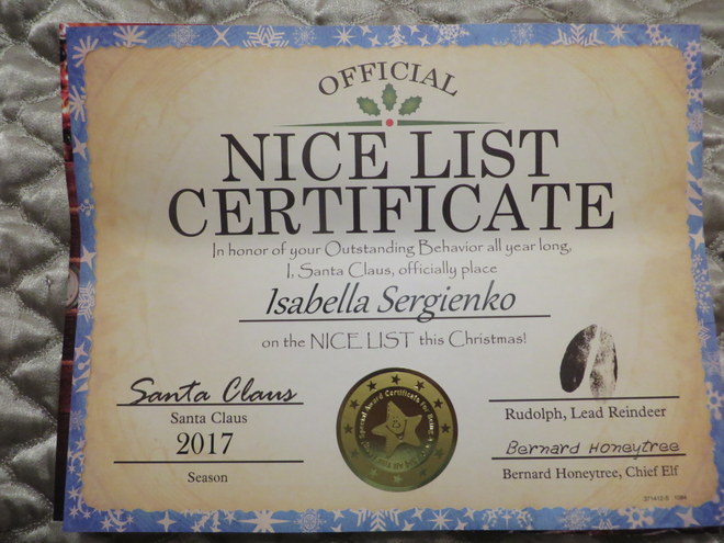 Вы заходите на сайт, регистрируетесь там и заполняете все, что необходимо для того, чтобы сделать все индивидуально для вашего ребенка! Чтобы получилась эта самая «прямая связь»:) После этого вы получаете по почте красивый индивидуальный пакет от настоящего Санта Клауса, с вашим адресом и именем ребенка (ему лично!:), в который входит индивидуальное письмо ребенку от Санты (текст, который подходит к вашему ребенку и ситуации вы заранее выбираете на сайте), само собой найс лист, а также фото Санты с дарственной подписью и фото оленя Рудольфа в детстве тоже с дарственной «подписью». На всем написано обращение Изабелла, и ребенку понятно, что все это Санта сделал именно для нее! Из этой печатной продукции очень хорошо потом делать скрапбук:)