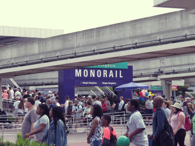 Поскольку парк Magic Kingdom расположен на острове, то вам пешком до него не добраться:) Потому весь народный поток тут же делится на две части: одни идут на монорельс, а другие на паром, оба транспорта само собой бесплатны:)