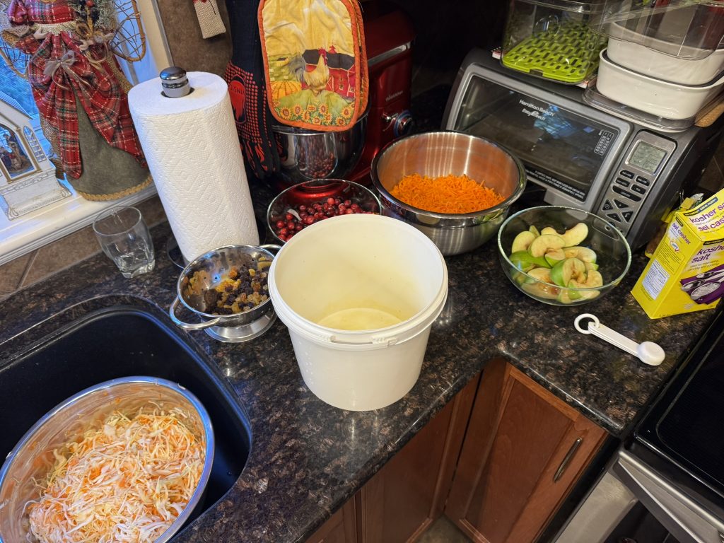 Оставляем это ведро с грузом в теплом месте на несколько дней. Сколько дней? У всех по разному, зависит от теплого места, чем теплее- тем быстрее:) Обычно может быть от трех дней и до недели. Я ставлю все это в гостевой ванной, там не жарко и потому у меня процесс идет не быстро:) Примерно дней пять добрых!