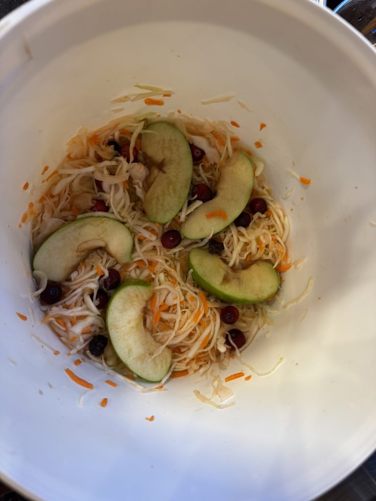 Теперь это все потисканное поступает в мой сборочный цех:) На дно ведерка я кладу капусту толстым слоем, приминаю ее там хорошенько плотненько. Затем кладу нарезанные дольками яблоки ( несколько долек), горстку клюквы и несколько изюминок ( щепоть:). Затем все повторяется: слой капусты примять, яблоки, клюква и изюм, и так до верха ведра.