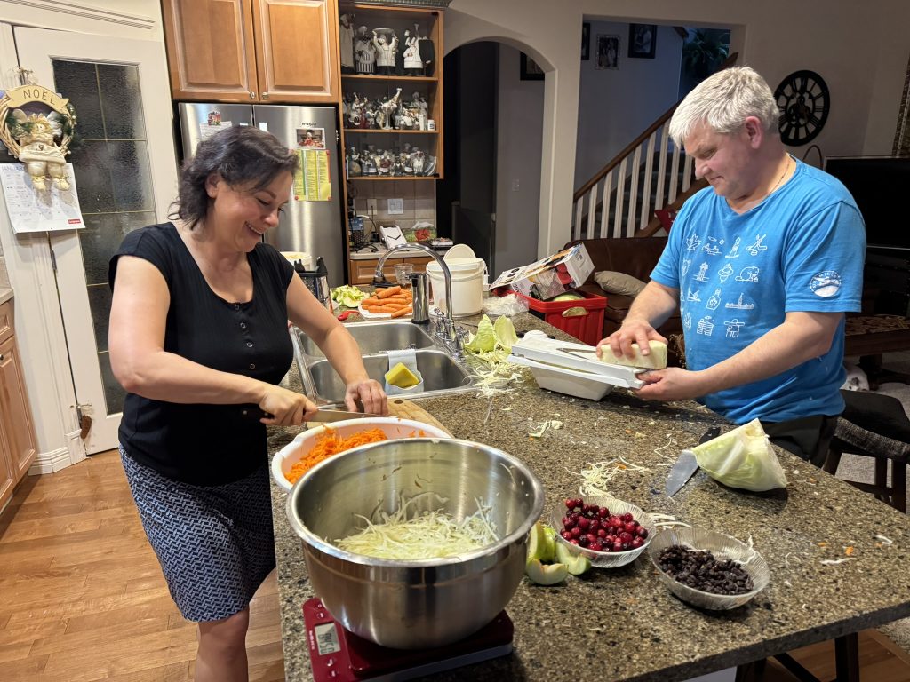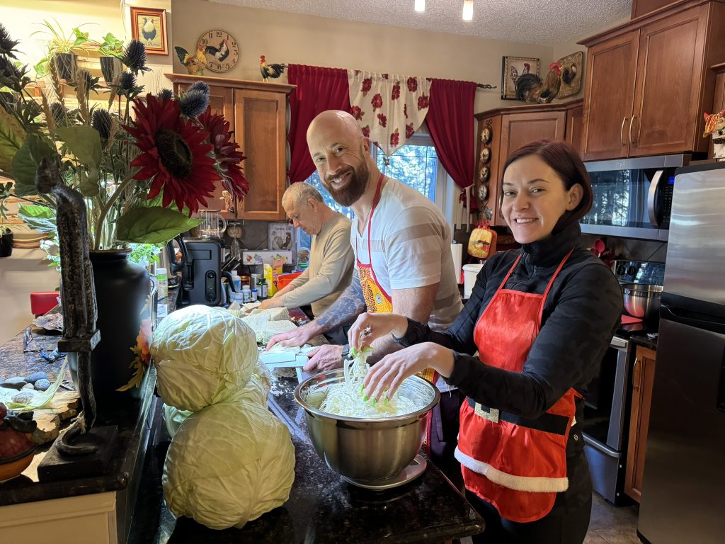 Ну и затем засолка капусты также стала семейным делом:) Так дочка с внучкой и новым зятем работали вместе с нами над стратегическим запасом капусты на зиму:) Зять у нас с немецкими корнями и квашеная капуста у них тоже в чести!:)